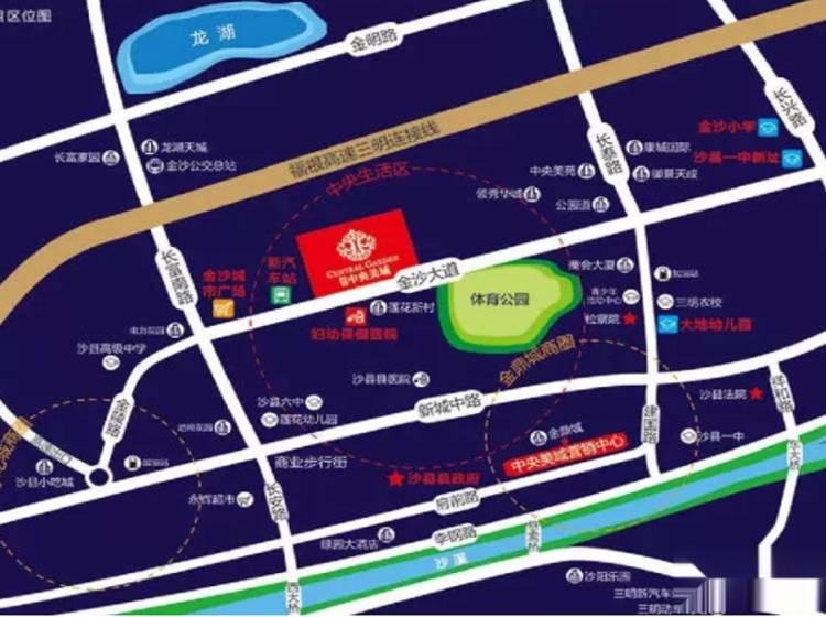 体育公园、新汽车站、沙县一中新址、金沙小学、金沙城市广场、公园道时代广场 百货商场、电影院、商业街、6.5万平米金沙城市广场