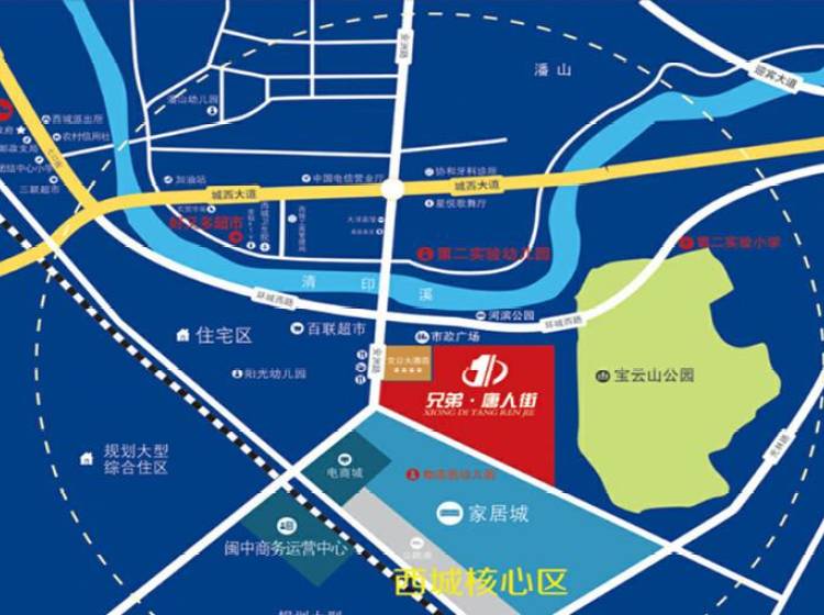 兄弟唐人街位于尤溪县西城镇三车东路3号,项目占地面积为24837.70㎡,建筑面积为79480.60㎡,容积率为3.2,绿化率为35%。
