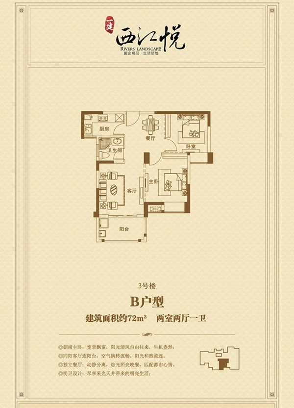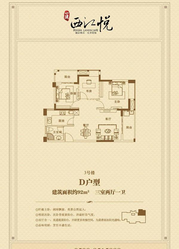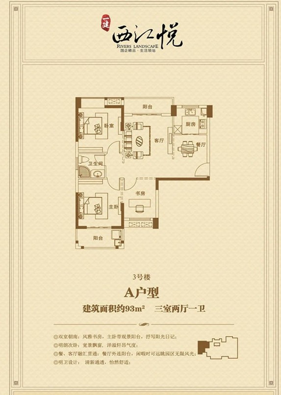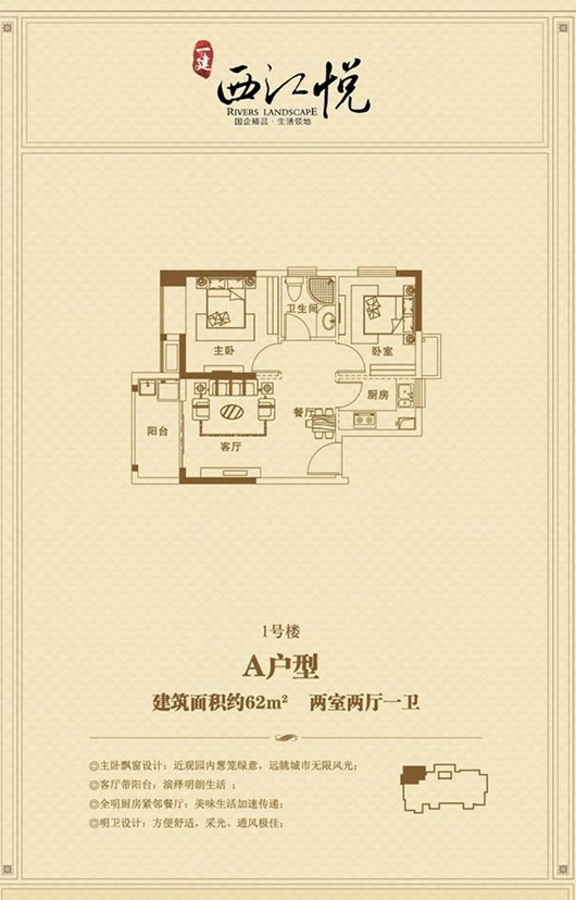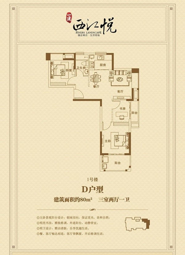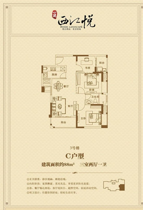 西江悦总建筑面积120000余平米,由10栋现代高品质住宅楼组成,规划总户数979户。建筑立面简洁、典雅、景观借鉴传统江南园林精髓,营造一个传统与现代相结合、自然与人文相融合的人居精品。项目配套齐全,6000余平米商业、1000余平米超市、1500余平米医疗服务中心配套。