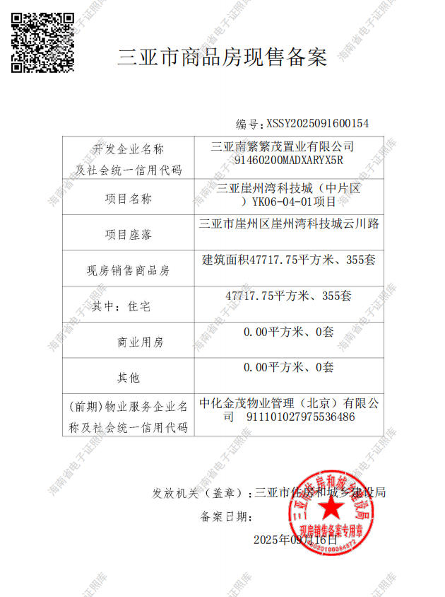 - XSSY2025091600154 详情发证时间 2025-09-16绑定楼栋建筑面积47717.75平方米、355套,其中(住宅):47717.75平方米、355套 ,商业用房:0.00平方米、0套, 其他:0.00平方米、0套。证件照片