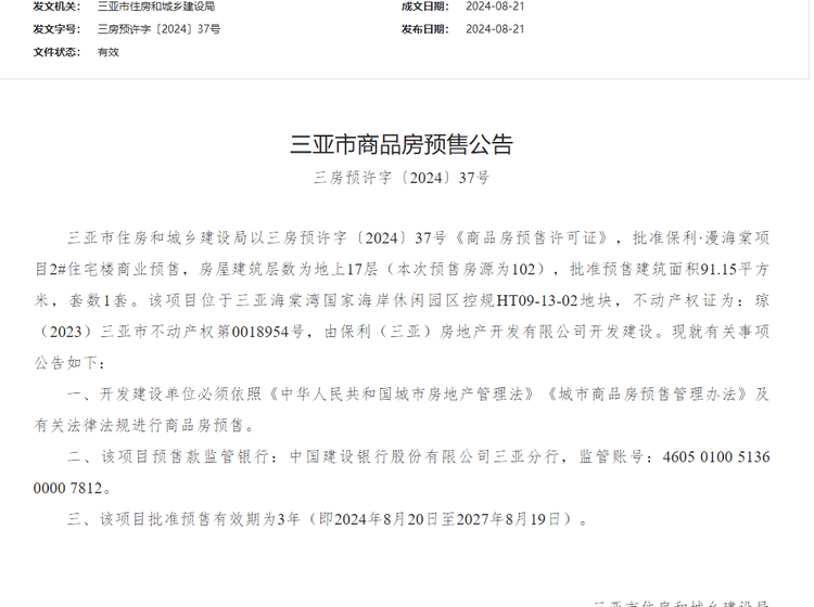 - 三房预许字〔2024〕37号 详情发证时间 2024-08-20绑定楼栋项目2#住宅楼商业预售,房屋建筑层数为地上17层(本次预售房源为102),批准预售建筑面积91.15平方米,套数1套。证件照片