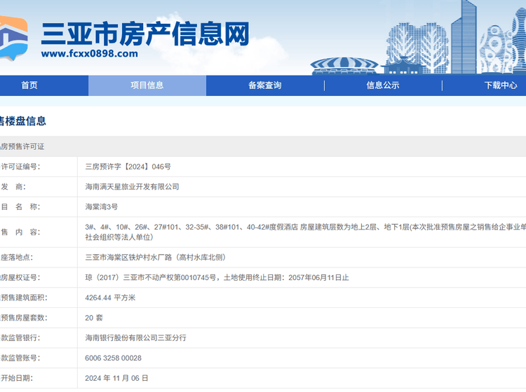 - 三房预许字〔2024〕39号 详情发证时间 2024-09-25绑定楼栋批准海棠湾3号C7-02-04地块项目(产权式酒店)主体酒店预售,房屋建筑层数为地上6层(本次预售房源:2层201—214,3层301—316,4层401),批准预售建筑面积2813.62平方米,套数31套。证件照片