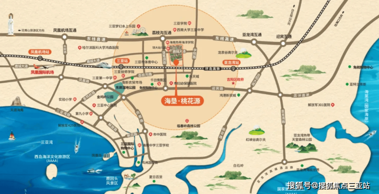 交通:落笔洞路、鹿城大道两大城市主干道交汇处,距环岛高速荔枝沟互通仅约800米,三亚动车站约7公里,三亚凤凰机场约17公里。立体交通路网,畅通全城乃至全球。