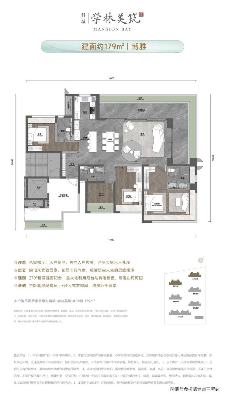 建面约124-179㎡的3-4房,户户标配大面宽空间、入户花园、宽景阳台及满配精装交付规格,户户尊享电梯入户,筑就崖州湾塔尖生活主场;头排产品建面约179㎡四房户型更可奢享逾18米奢致面宽、270°环幕观景阳台与双套房高定配置,独揽万千尊崇。