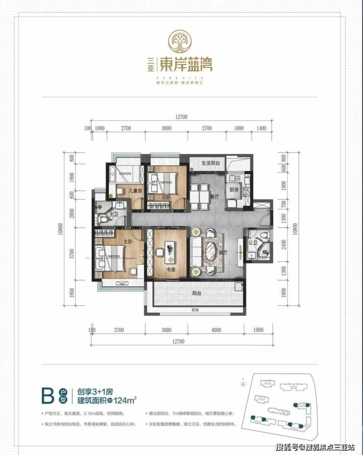 ▼B户型:建面约124㎡创享3+1房