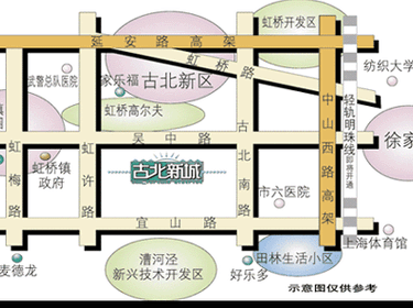 古北新城由实力雄厚的新长宁集团和复地集团联合开发,位于上海市闵行区虹桥镇,属金虹桥地区,处在闵行区、长宁区、徐汇区三区交界处。