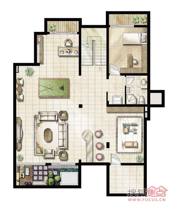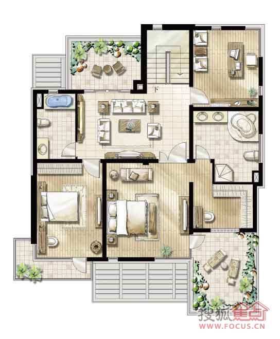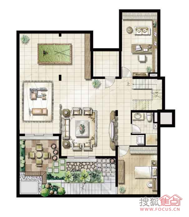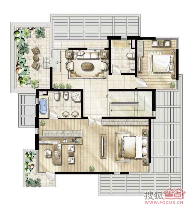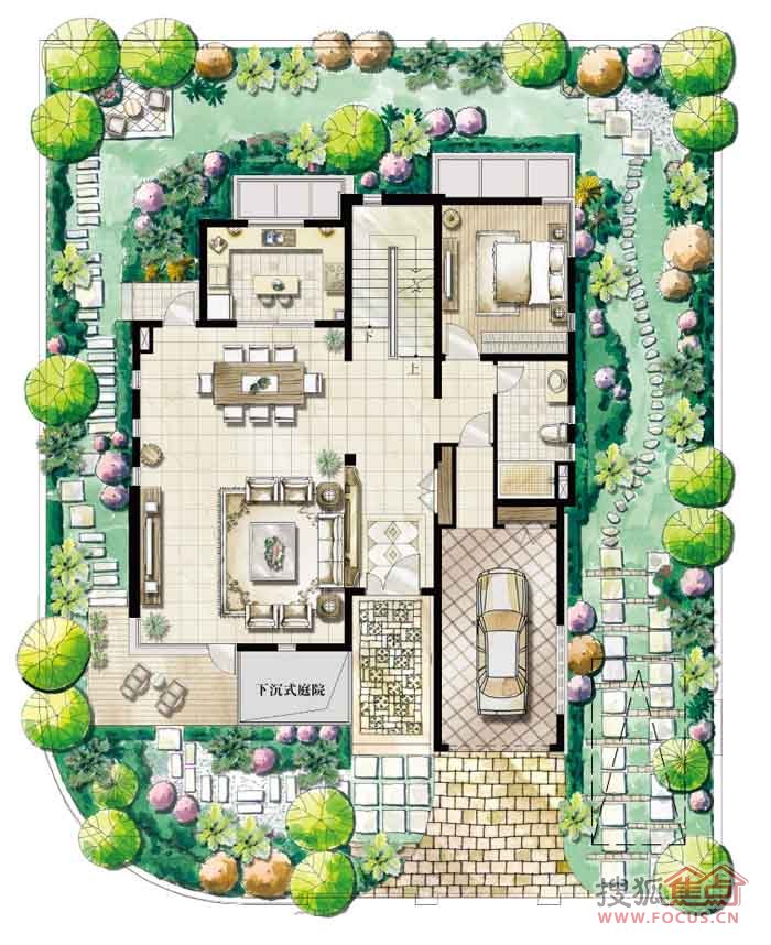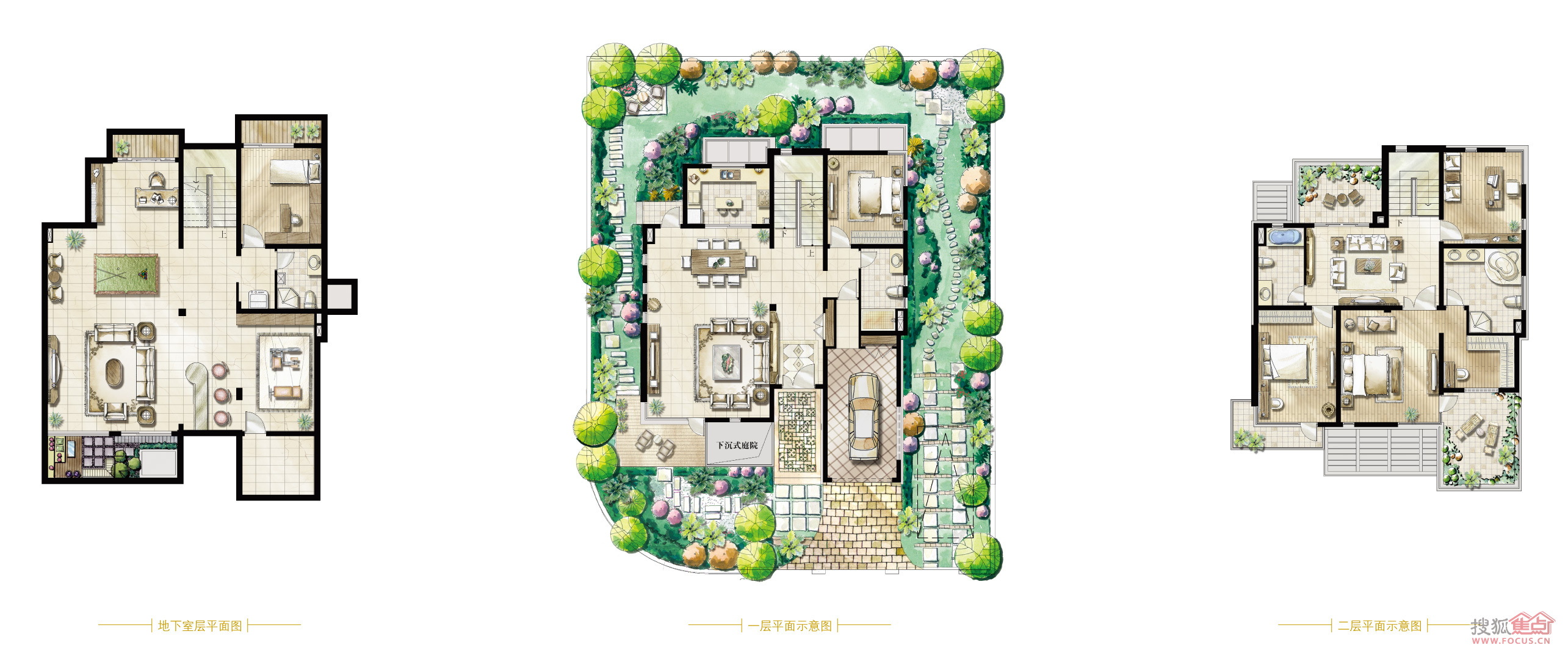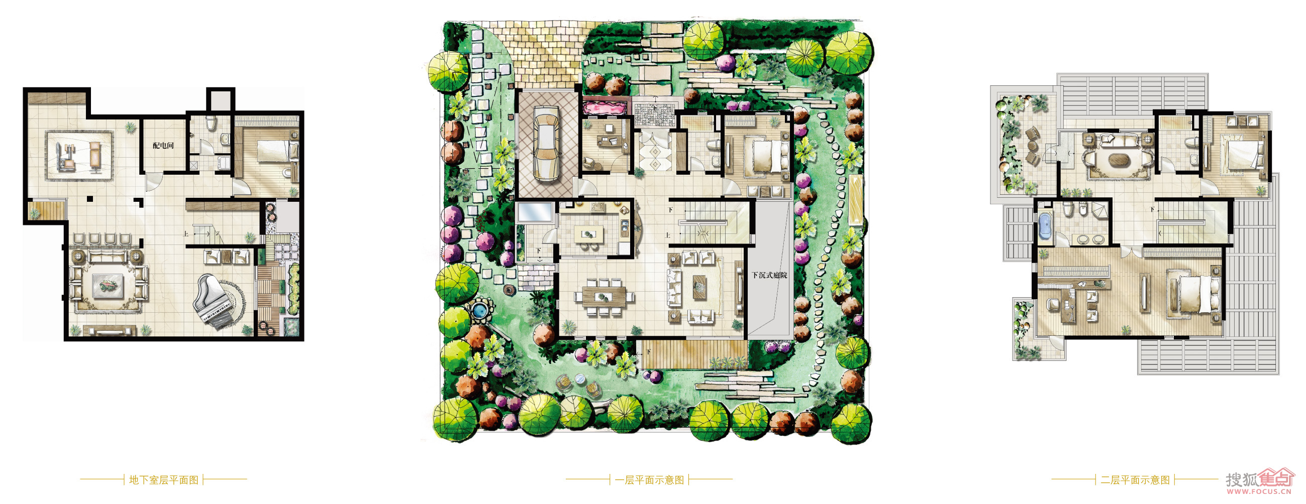 所有户型均配有会所式地下室伴有下沉式庭院,除具直接采光、通风功能外,还突破性地设计了排水系统及全框架剪力墙结构。每一套别墅的庭院都被精心打造成成品私家花园,通过铺装,特色小品和丰富的绿化植物,创造出精致,简洁,绿化丰富,更具个性的庭院。