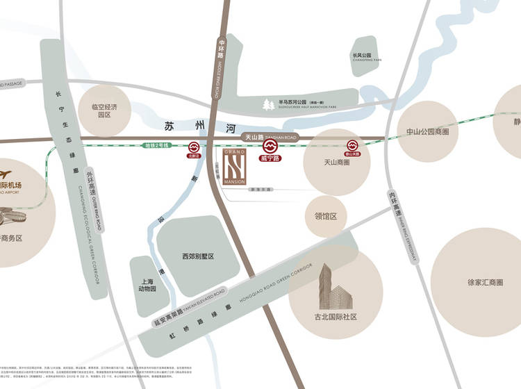 【内环路】快速通达徐汇滨江、陆家嘴、上海站、虹口足球场等经济、文化、商业的核心地带【地铁2号线】直线距离威宁路站约800m,北新泾站约200m,东向2站中山公园,4站静安寺,6站人广,9站陆家嘴,直抵浦东国际机场,西向3站虹桥2号航站楼,4站虹桥火车站,是上海名副其实的国际线