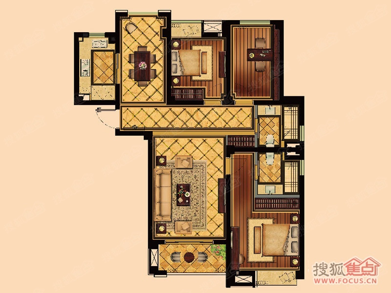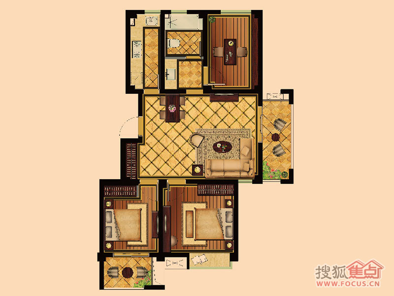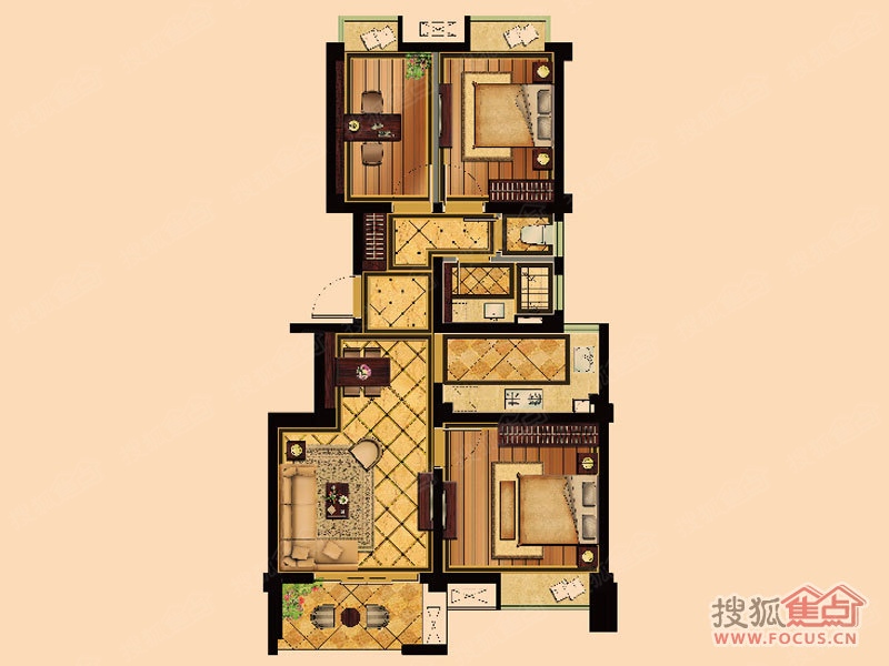3室2厅1卫-兆地尊庭B户型图3室2厅1卫1厨-90.00㎡