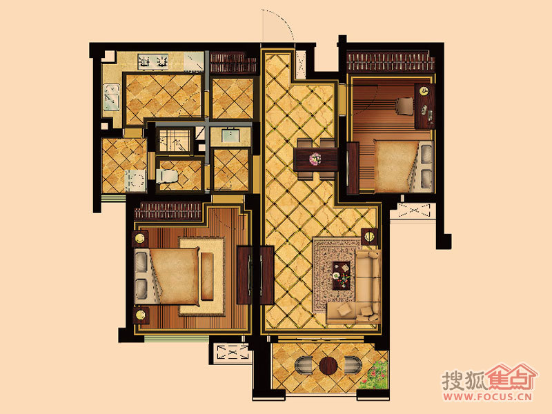 2室2厅1卫-兆地尊庭F户型图2室2厅1卫1厨-83.00㎡