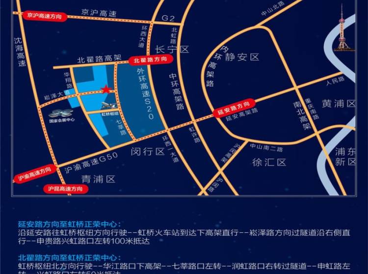 虹桥正荣中心位于虹桥商务区核心区, 虹桥商务区作为上海面向长三角的门户,发达的交通网络设施,轨、路、空立体交通体系,平均日客流量达百万人次;国家会展中心依托虹桥商务区得天独厚的区位优势,打造了会展硬件设施及配套服务一流、贸易驱动力强、商业特色新颖、经济效益和社会效应俱佳的会展综合体。