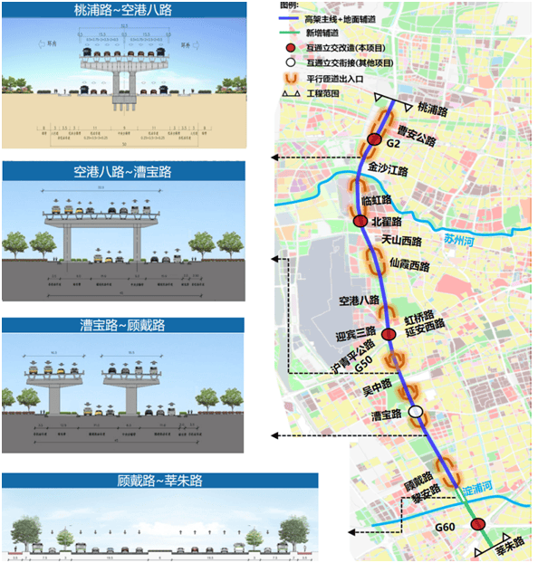 外环西段交通功能提升工程主线北起桃浦路、南至黎安路,全长约15.3公里,采用城市快速路标准,标准段采用双向8车道,地面辅道范围桃浦路至莘朱路,全长18.1km,双向4-6车道,共涉及嘉定、长宁、闵行三区。沿线改造G2、北翟路、G50三处互通立交,同步改造桃浦路、金沙江路、北翟路、天山西路、仙霞西路5条横向道路。项目建成后,可有效疏解沿线横向干道节点的交通压力,缓解节点性拥堵问题,打通西部高快速路网瓶颈,提升路网整体运行水平,激发城市活力,促进沿线区域经济社会发展。