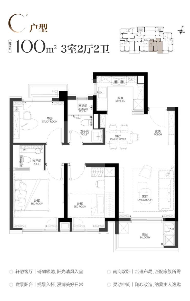 在产品打造上,项目外立面采用大面积玻璃与金属材质组合,现代感十足;社区内规划精致庭园、全龄段运动休闲场地,配备星级车库、地上地下双大堂及智慧门禁系统,归家仪式感拉满。户型设计更是兼顾实用性与舒适度:88㎡两房适配单身或两人世界的精致生活需求,100㎡三房则实现三开间朝南、动静分离、主卧套房等优质配置,部分户型更有三飘窗 + 南向大阳台的观景空间,通风与采光俱佳。
