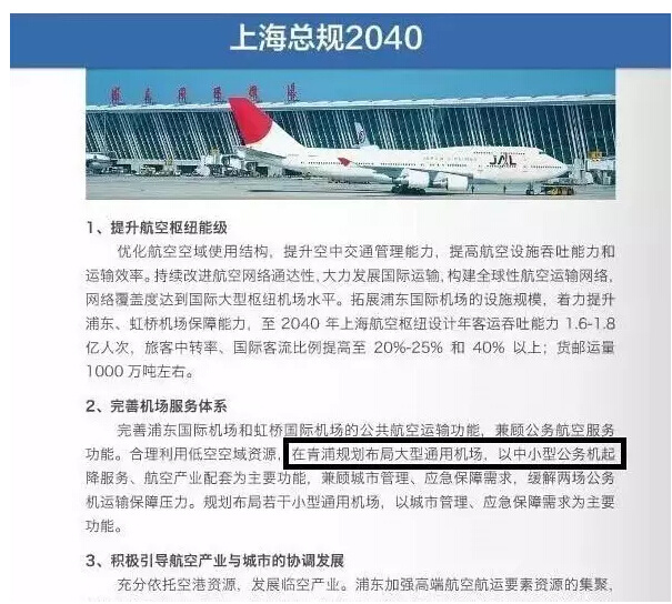 此外,规划布局若干个小型通用机场,以城市管理、应急保障需求为主要功能,预留发展水上飞机功能的岸线配套条件。前一段一直传闻上海将在周边建设“第三机场”,规划中没有提及,却规划建设通用机场,而且就计划在青浦。通用机场主要服务公务机、私人飞机、直升机等飞机起降,将和浦东机场、虹桥机场的民航功能相区分。据消息灵通人士透露,选址在练塘!