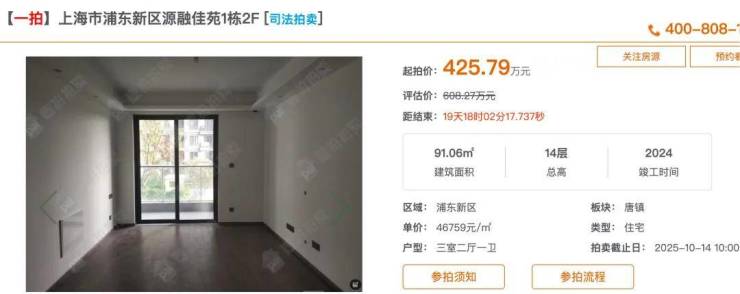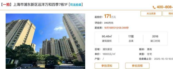 近日,某法拍平台集中挂牌浦东两个次新房小区的法拍房源。其中,唐镇板块的融创未来金融城有64套,起拍均价仅4.84万元/平方米,相当于评估价打七折;惠南板块的远洋万和四季也有113套房源上架拍卖,总价最低170万元/套,同样约为评估价七折。