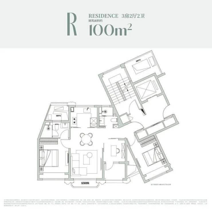 户型设计同样乏善可陈。比如100㎡R户型采用非常规异形布局,空间不规整,利用率低,不符合高端客群的居住习惯。客厅外面的装饰架构,不能直接当作阳台使用。阳台设置在书房外面,面积也不大。