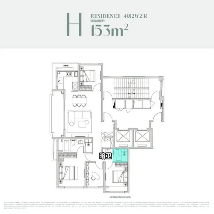 再比如大一点的153㎡H户型,亮点在于西侧横厅及景观阳台,但代价是牺牲了房间的尺度感,同时次卫还是一个暗卫,北房间要使用卫生间还要经过长过道。