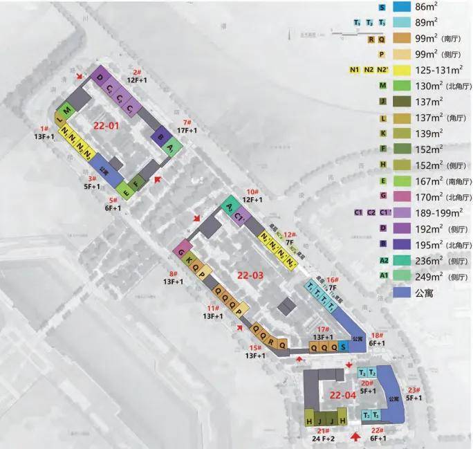 面对本就偏高的容积率,前滩滨江道在规划设计中却作出了令人费解的安排:三个地块采用围合式布局,住宅与商业混杂,楼栋高度参差不齐。其中,22-01地块(容积率3.0)包括4栋6-18层住宅及2栋商业;22-03地块(容积率2.5)规划7栋7-14层住宅与2栋商业;22-04地块(容积率2.5)则布置了3栋6-25层住宅及2栋商业,总计规划约547套住宅。