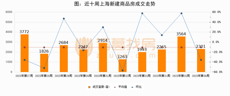 进入2025年第36周(09月01日-09月07日),上海新建商品房成交2301套,较上周减少1263套,环比下降35.4%。从近十周成交来看,周均成交套数为2482套,本周成交2301套,低于近十周平均成交量7.3%。
