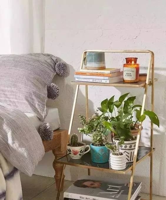 再比如,可以把小型登高梯当成床头柜,由于使用频率较低,用时再拿出来,岂不是连平日存放的地方都省了?