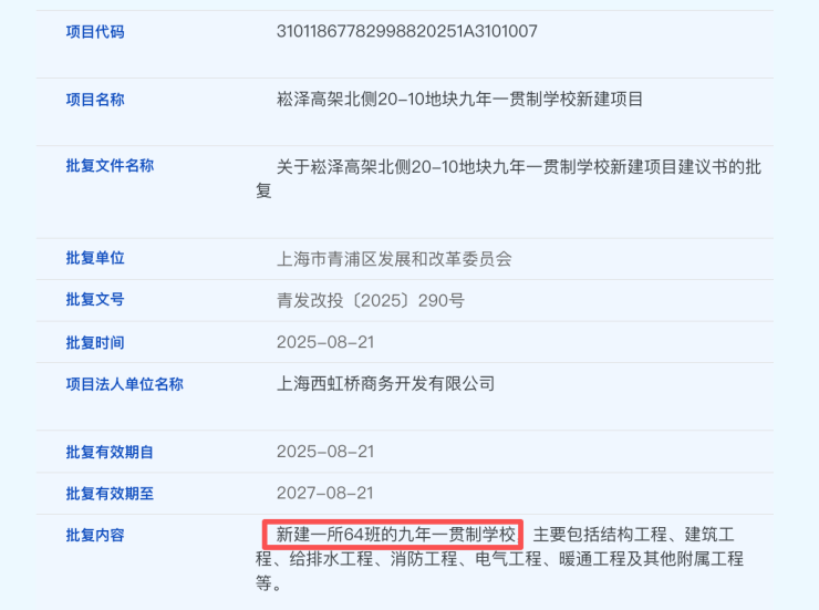 2025年8月,青浦区官网发布关于崧泽高架北侧20-10地块九年一贯制学校新建项目建议书的批复,新建一所64班的九年一贯制学校,主要包括结构工程、建筑工程、给排水工程、消防工程、电气工程、暖通工程及其他附属工程等。