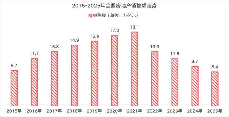 直至2022年,三道红线拉爆房企,让房企高周期的模式无以为继,房地产行业进入调整阶段,销售额从2021年峰值的18万亿逐年下降,2025年下降至8.4万亿,几乎与2015年持平,有人不禁感慨“一夜回到十年前”。