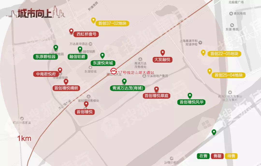 淀山湖大道站:这里是当前17号线沿线周边在售和待售项目最多的站点,也是最受购房者关注的板块。2015-2017年,这里经常上演“土拍大战”,数十家房企戮战争夺一幅地块的景象屡见不鲜。如今这些地块部分已售罄,也有项目在售、在建。