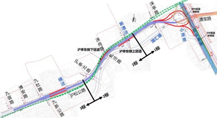 工程采用“主线高架+地面辅道”的总体方案,均为双向六车道。其中,高架主线采用城市快速路标准,设计时速60-80公里;地面辅道为二级公路(城镇段)标准,设计时速50公里。北段工程北接漕宝快速路及嘉闵高架路,建成后将有效串联起沿线重点区域。