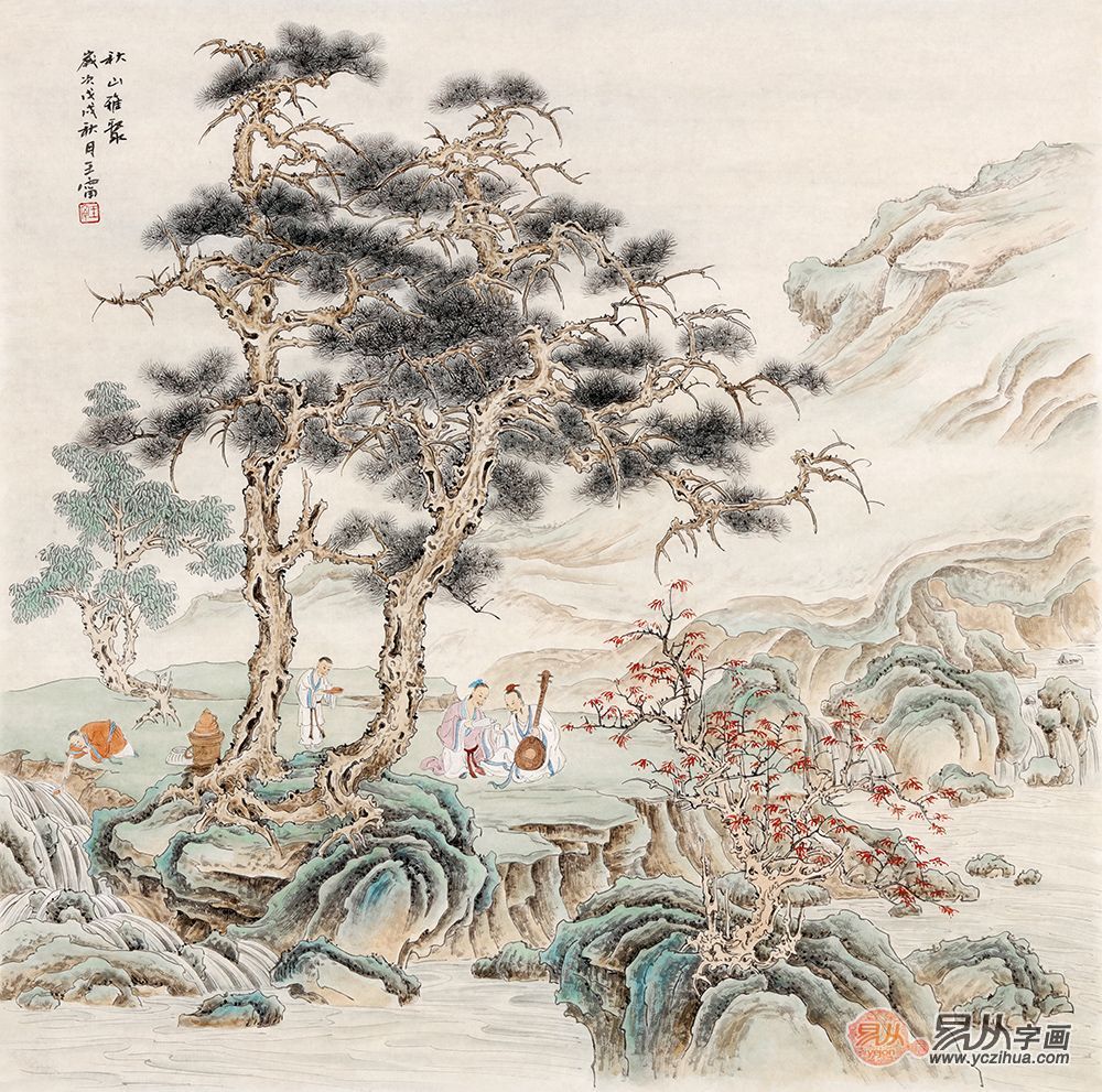 王宁新品力作仿古斗方山水画作品《秋山雅聚》
