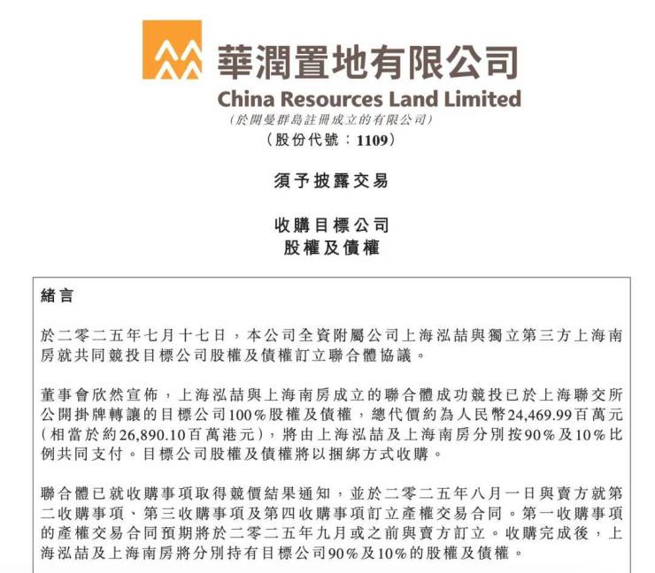 8月1日,华润置地发布公告,联合南房集团共同获取浦东后滩及黄浦余庆里资产包,总金额244.7亿元,由华润旗下全资子公司上海泓喆及上海南房分别按90%及10%比例共同支付。