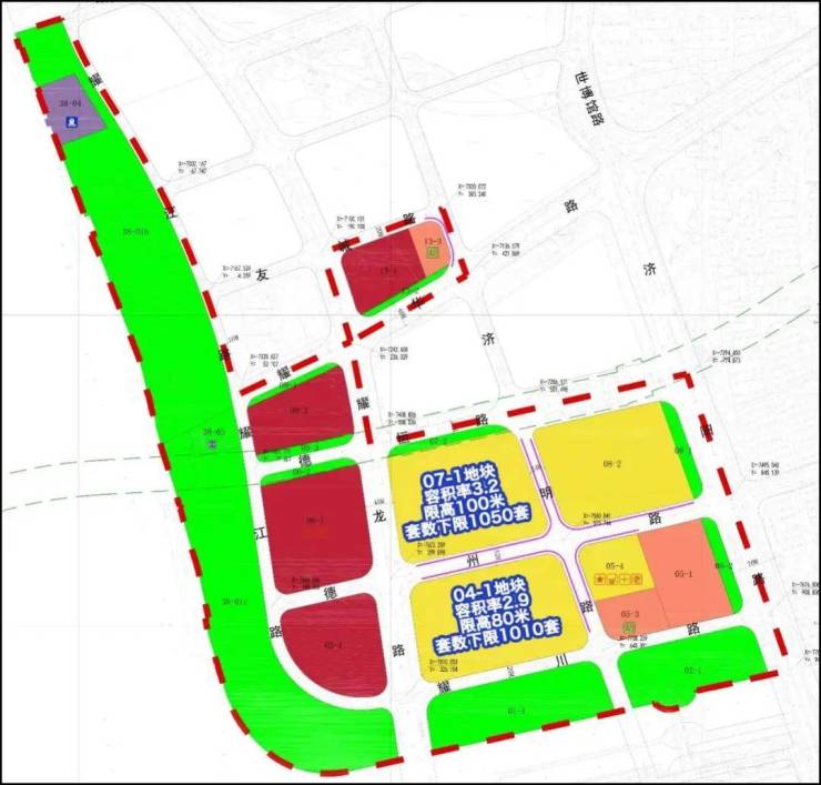 南侧的04-1地块占地面积4.19万㎡,容积率2.9,住宅限高80米,住宅套数下限为1010套。同样有40%中小套型要求,100%全装修,无租赁用房/保障房比例要求。