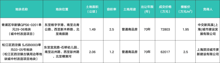 近日,上海市青浦区华新镇与松江区泗泾镇两宗城中村改造项目完成协议出让,结果正式公示。两宗地块总用地面积约3.55公顷,总建筑面积约6.2万平方米,成交总金额达13.48亿元。