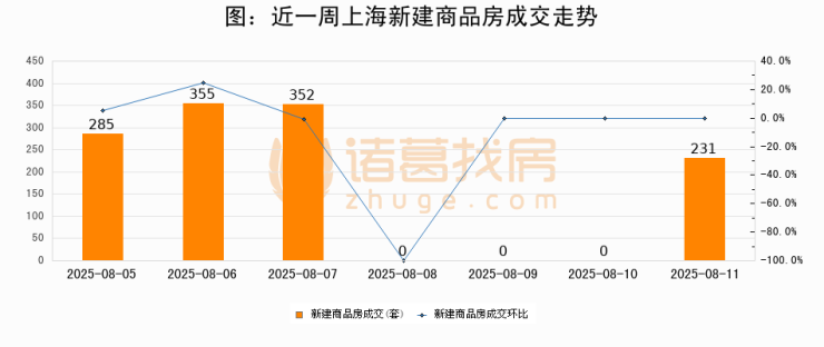 根据上海市房地产交易中心数据显示,2025年08月11日上海新建商品房成交231套,较昨日增加231套,环比上涨0%。近一周上海新建商品房日均成交175套。08月11日单日成交231套,高于近一周平均水平32%。