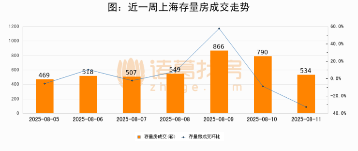 从存量房来看,2025年08月11日上海存量房单日成交534套,比昨日减少256套,环比下降32.4%。从近一周存量房成交来看,上海存量房日均成交套数为604套,08月11日单日成交534套,低于近一周平均水平11.6%。