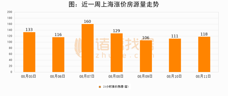 根据诸葛找房数据显示,上海24小时涨价房源量为118套,较08月10日增加7套,环比上涨6.3%。与此同时,涨价房源占比小幅扩大,业主信心有所提升。