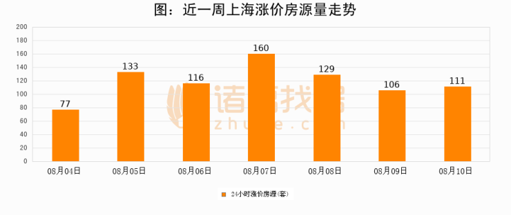根据诸葛找房数据显示,上海24小时涨价房源量为111套,较08月09日增加5套,环比上涨4.7%。与此同时,涨价房源占比小幅扩大,业主信心有所提升。
