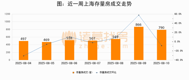 从存量房来看,2025年08月10日上海存量房单日成交790套,比昨日减少76套,环比下降8.8%。从近一周存量房成交来看,上海存量房日均成交套数为599套,08月10日单日成交790套,高于近一周平均水平31.9%。