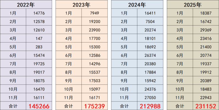 结合2022年-2025年1-11月份二手房成交趋势来看,今年1-11月二手房月度成交总量为23.1152万套,为近四年最高位!