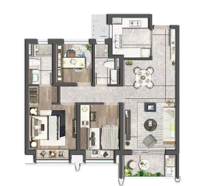 100㎡3房2厅2卫设计,客厅和两个卧室三开间朝南,主卧和次卧均为阳光房。客厅附带大面积景观阳台,采光和通风效果都不错。主卧为套房设计,自带步入式衣帽间和独立卫生间,私密性和实用性俱佳。