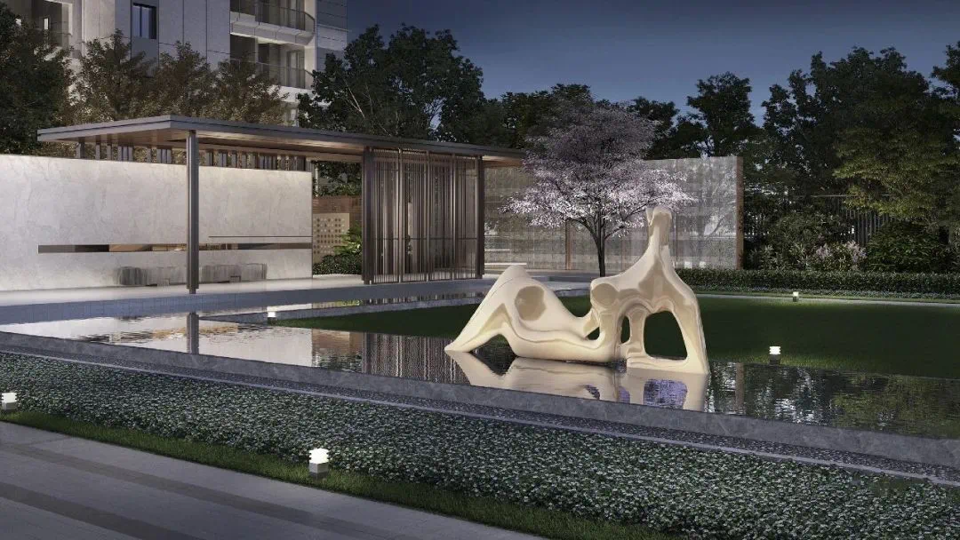 在业主的归家动线上,以水庭空间、景墙、跳泉、雕塑水晶,这四重精致景观来营造业主归家的仪式感。