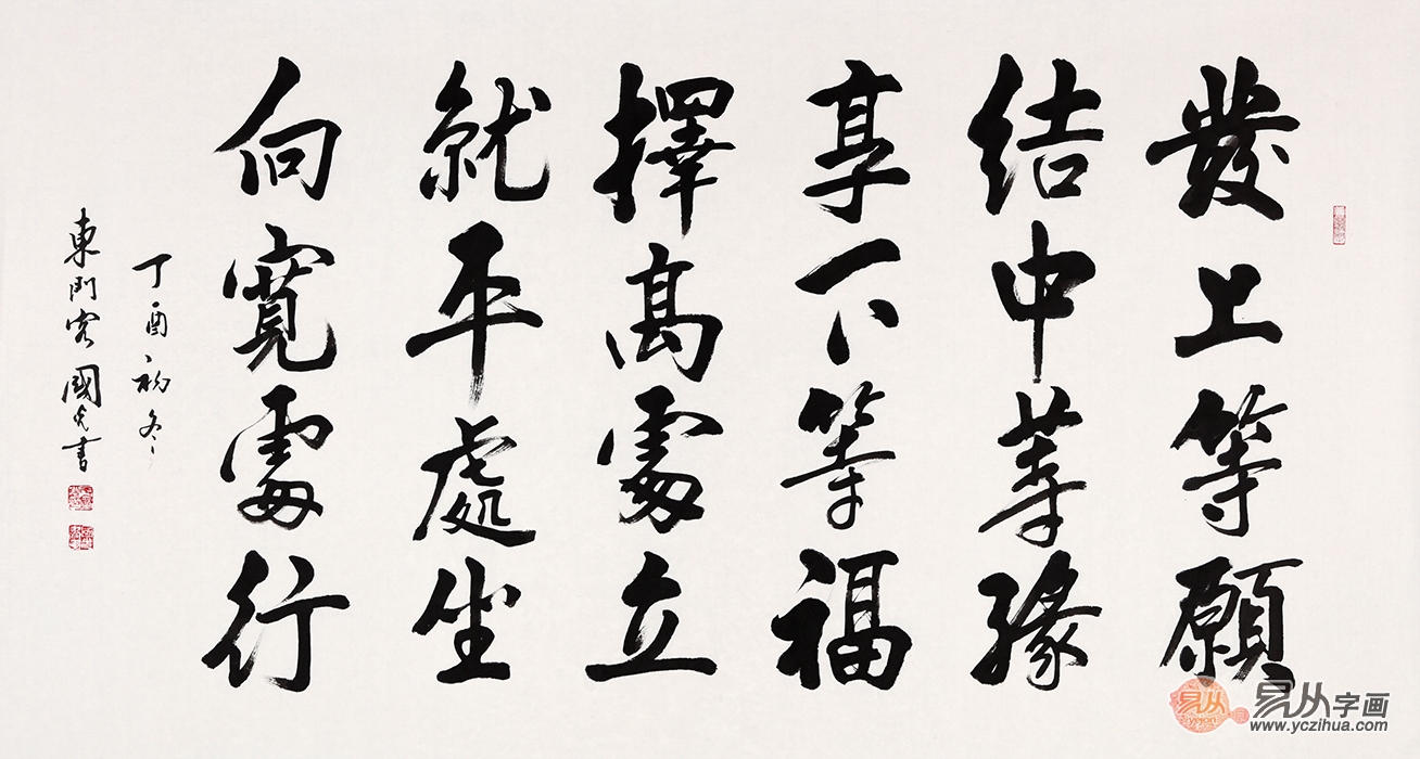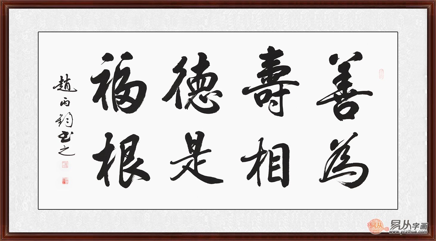 赵丙钧老师《善为寿相 德是福根》书法作品,其扎实的书法功底在流畅的笔墨和整齐布局的作品中展现出来,笔体粗壮,其张弛有度的笔法结构,具有颇高的艺术观赏性崇。这幅作品充分地将其书法风格特点表现出来,字体结构分明、运笔稳如泰山,笔法强劲有力,一笔一划之间有一种力量在流转,朴实之中尽显无限高雅,结体厚重彰显典雅。用于装饰、收藏皆适宜。