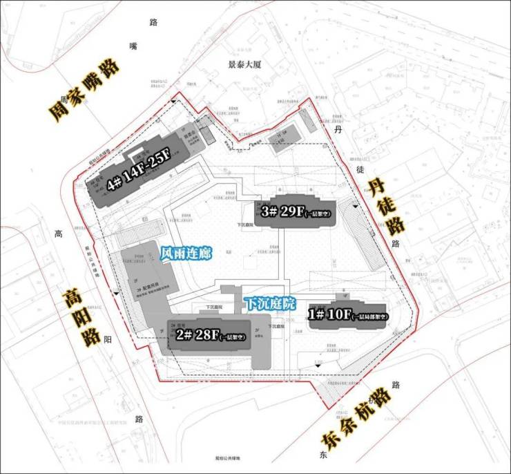 根据虹口官网公示的设计方案,绿城项目拟建四栋住宅,其中1#住宅总高10层;2#、3#住宅总高28-29层,限高100米;4#总高14-25层,限高80米。