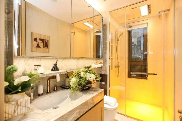满配交付:一步到位的“完整生活解决方案”项目装标绝非品牌堆砌,而是围绕高频生活场景构建的系统方案。厨房精选国际一线豪宅同配厨电九件套,集成嘉格纳油烟机、灶具;博世嵌入式冰箱、洗碗机、保温碟抽、嵌饮机、蒸烤机;日立厨房专用空调;A.O.史密斯热水器等。卫浴配备科勒维C美研梳洗龙头、奥普光子嫩肤美容浴霸、美妆镜箱+美妆冰箱汉斯格雅、杜拉维特,构筑了品质生活的硬件基础。