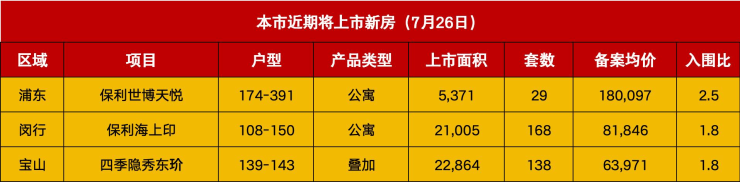 7月26日,网上房地产官宣3个新盘过会名单,涉及浦东、闵行和宝山3个区域的新房项目,合计供应面积49240平方米,共335套房源。本批最高备案均价是浦东新区的保利世博天悦18万元/㎡。