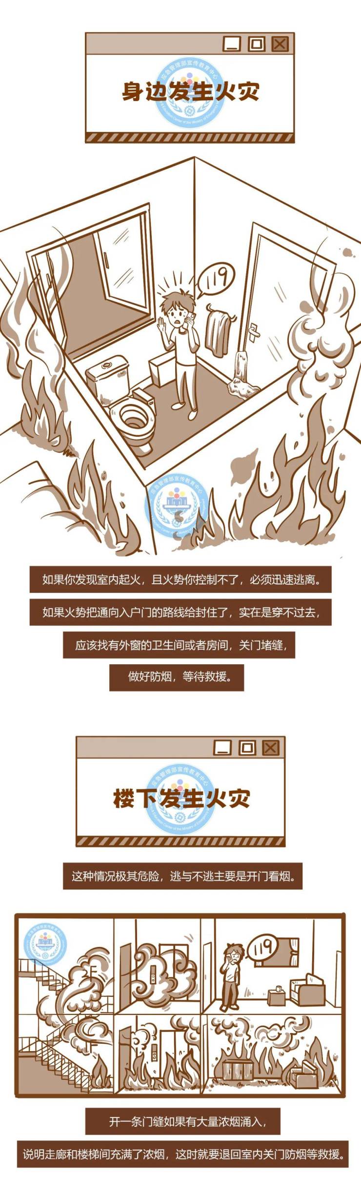 关于跳楼逃生:只有在消防队员准备好救生气垫或楼层较低(通常是三楼以下)且不跳必定丧生火海的情况下,才考虑跳楼。跳楼前尽量先向楼下抛掷软物缓冲,抱头屈身,减少伤害。