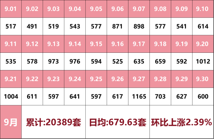 上海9月日均成交679.63套,环比8月日均642.32套,上涨2.39%;同比24年9月531.4套,上涨28.13%!