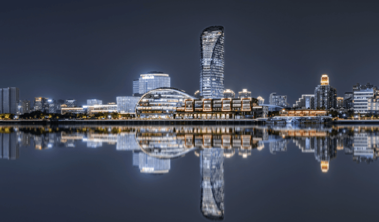 建筑设计上,带来一次「静奢革新 审美革新 天际革新 精神革新」,项目汲取外滩万国建筑博览群的质感,采用大面积铝板与玻璃幕墙的精密拼接,米白色铝板勾勒出几何线条,打造杨浦新的美学天际线