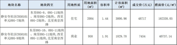 据上海土地市场公示的信息显示,此次协议出让的两幅地块为静安区静安寺社区C050101单元095-7、095-9地块,地块大小非常迷你。