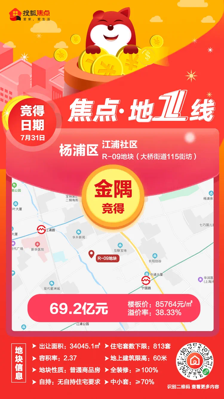 刚刚,杨浦区江浦社区R-09地块(大桥街道115街坊)经过95轮竞拍完成出让,北京金隅地产开发集团有限公司(金隅)以69.2亿元成功竞得该地块,溢价率38.33%,折合楼板价85764元/㎡。