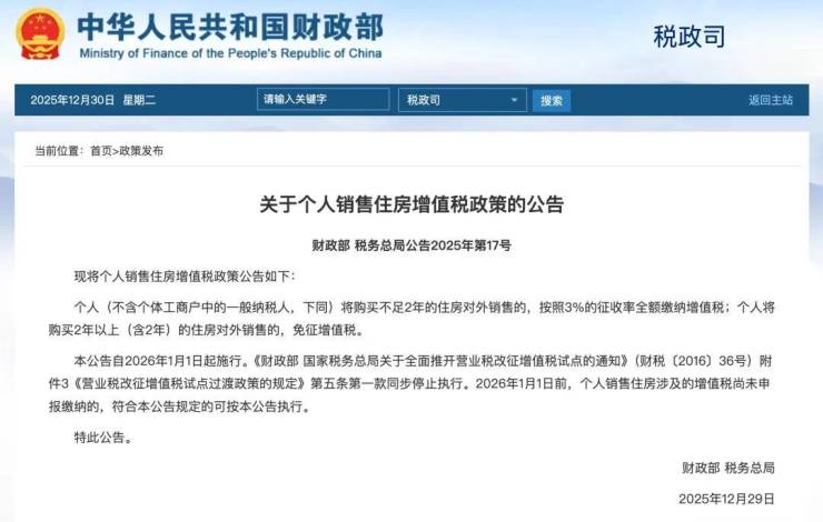 12月30日,财政部、税务总局发布《关于个人销售住房增值税政策的公告》。根据公告: